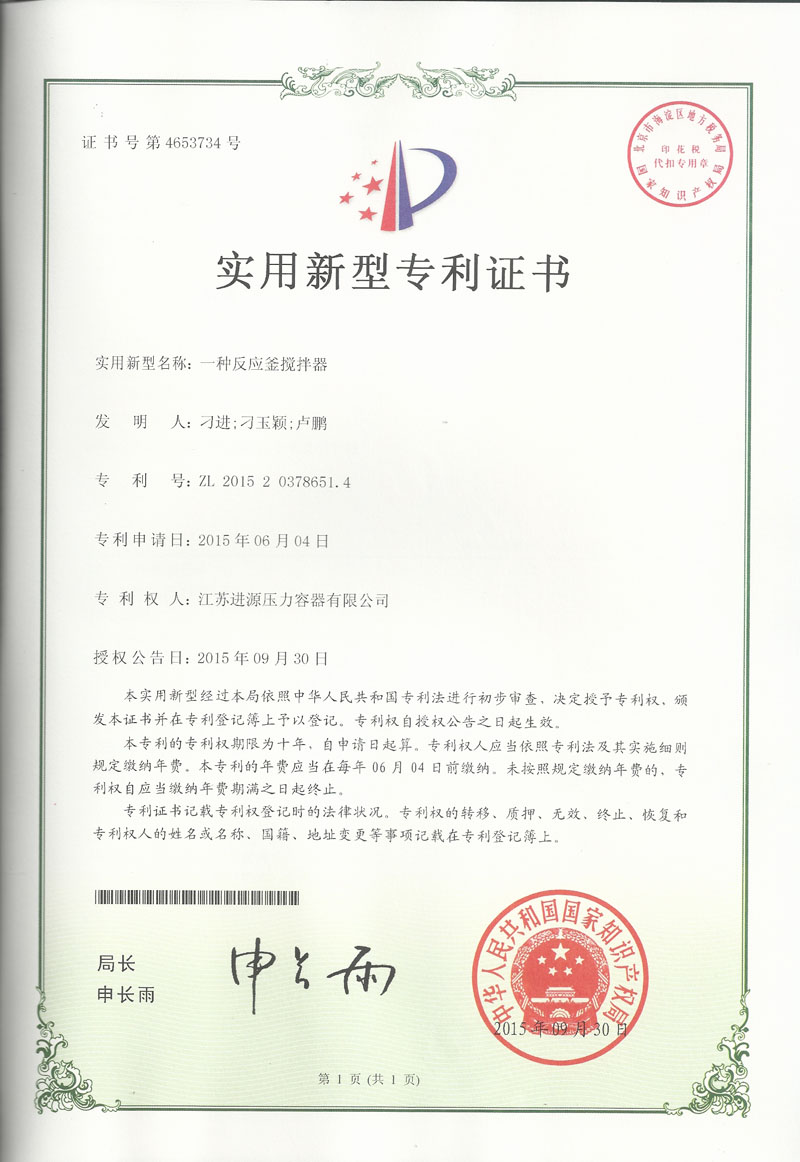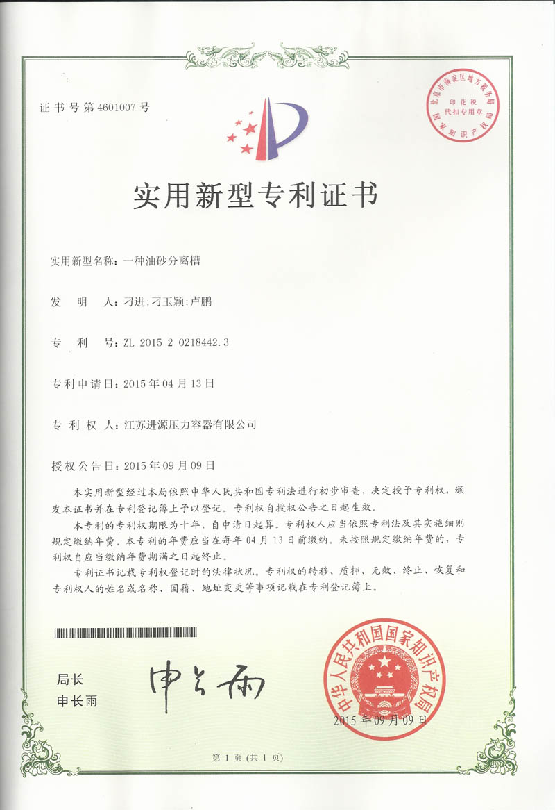 江蘇進源壓力容器有限公司自主研發(fā)的“一種油砂分離槽”、“一種反應(yīng)釜攪拌器”、“螺旋板換熱器”、“一種高效節(jié)能蒸發(fā)式冷凝器”等四項創(chuàng)新成果,均獲得國家知識產(chǎn)權(quán)局專利授權(quán),專利期限為十年。另外申報的15項發(fā)明專利也被國家知識產(chǎn)權(quán)局受理。